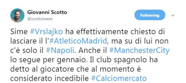 Arrivano interessanti aggiornamenti circa il mercato del Napoli. Il giornalista de Il Roma, Giovanni Scotto, sul proprio account Twitter riferisce che Sime Vrsaljko, primo obiettivo per le fasce a gennaio, avrebbe chiesto la cessione all’Atletico Madrid.