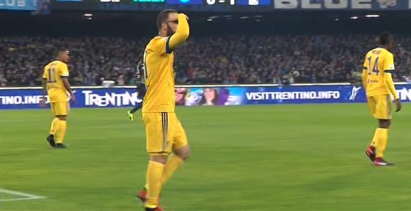 Ebbene dopo la rete del vantaggio bianconero, Higuain si è portato la mano all’orecchio un po’ per dire “non sento i vostri fischi“. Poi si è portato la mano alla fronte scorgendo De Laurentiis. Un gesto evidentemente provocatorio.