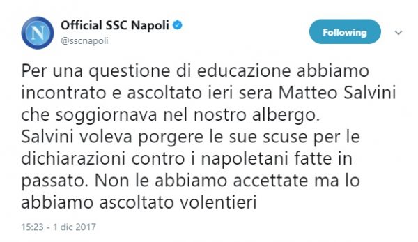 Il Napoli ha chiarito su Twitter l’incontro avvenuto ieri con Matteo Salvini: