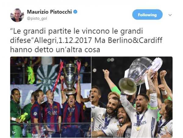 Il giornalista ha infatti ripreso alcune dichiarazioni dell’allenatore dei bianconeri dopo la vittoria con il Napoli: “Le grandi partite le vincono le grandi difese“. Poi ha affondato pungendo Allegri: “Ma Berlino&Cardiff hanno detto un’altra cosa“, rimarcando le sconfitte rimediate nelle ultime due finali di Champions League.
