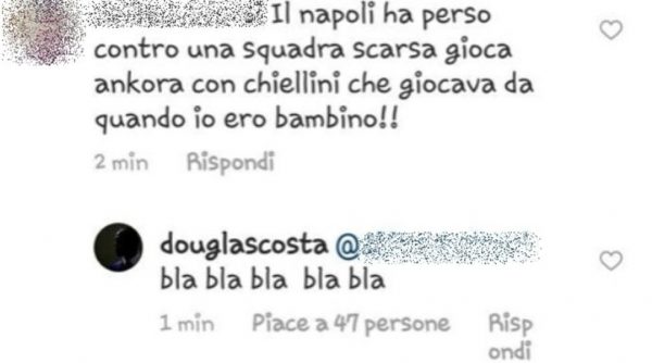 A rispondere al tifoso è stato addirittura Douglas Costa che – come dimostra una foto pubblicata sull’edizione online di Tuttosport – scrive: “bla bla bla bla bla“.