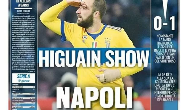 Più sarcastico Tuttosport: “Higuain show, Napoli dove sei?“, giocando sull’esultanza del Pipita.