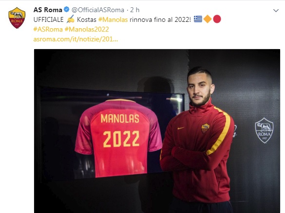 Questo il comunicato emesso: “L’AS Roma è lieta di annunciare che Kostas Manolas ha rinnovato il proprio contratto con il Club fino al 30 giugno 2022. Il difensore greco, classe ’91, è arrivato in giallorosso nell’estate del 2014 e con la maglia della Roma ha finora collezionato 144 presenze e 4 reti“.