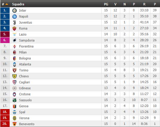 Si chiude la domenica di Serie A. L’Inter si è imposta sul Chievo con un perentorio 4-0 e si è presa la vetta, la Fiorentina ha strapazzato il Sassuolo con un sonoro 3-0. Bologna e Cagliari invece si sono divisi la posta: 1-1. Nel posticipo la Lazio ha vinto a Genova contro la Sampdoria, in rimonta.