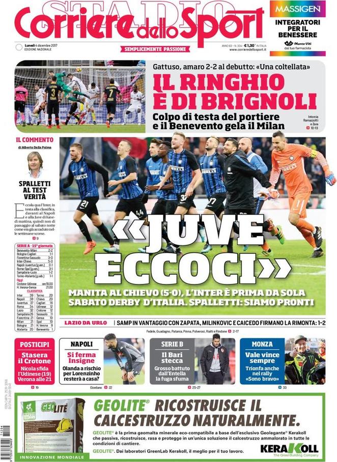 Elogi, anche meritati, li dedica il Corriere dello Sport all’Inter, proprio nella settimana in cui i nerazzurri faranno visita alla Juventus a Torino. Spazio anche ad Insigne, a rischio per la trasferta olandese che il Napoli giocherà mercoledì contro il Feyenoord, decisiva per la qualificazione agli ottavi di Champions.