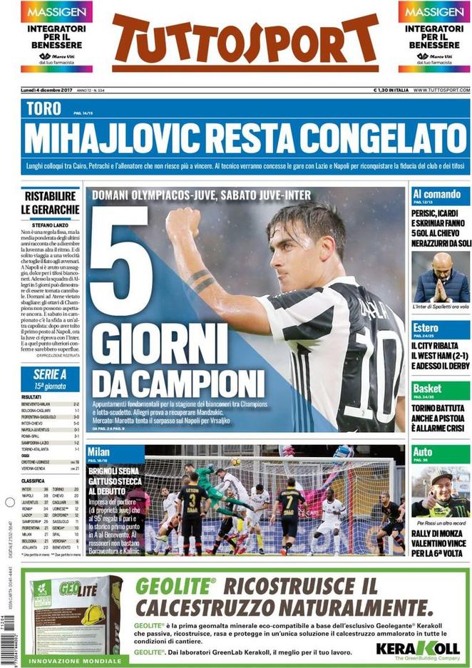 Il quotidiano di Torino ovviamente dedica alla Juventus la sua prima pagina: i bianconeri possono completare la cinque giorni da campioni vincendo e superando il turno di Champions League, bissando il successo che è tornato prepotente già in campionato contro il Napoli. Intanto Marotta tenta l’affondo di mercato: la Juve vuole superare il Napoli per Vrsaljko. In casa Toro non tira una buona aria: Mihajlovic resta appeso ad un filo, ora le partite con Lazio e Napoli saranno decisive per il futuro del tecnico serbo.