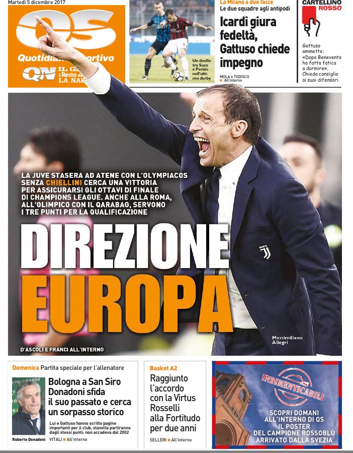 Anche il Quotidiano Sportivo celebra in prima pagina l’imminente impegno della Juventus in Champions League: “Direzione Europa“, mentre in taglio alto spazio per le milanesi: “Icardi giura fedeltà, Gattuso chiede impegno“.