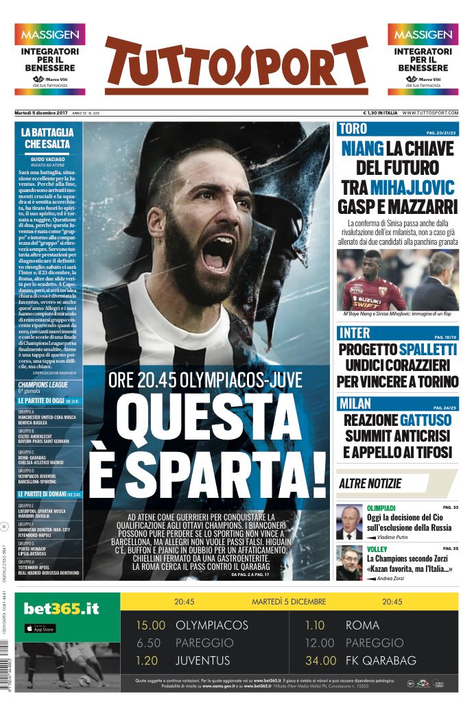 Anche Tuttosport parla della sfida di Champions della Juventus: “Questa è Sparta“. Mentre in taglio alto spazio al futuro di Mihajlovic con Gasperini e Mazzarri che potrebbero subentrargli.