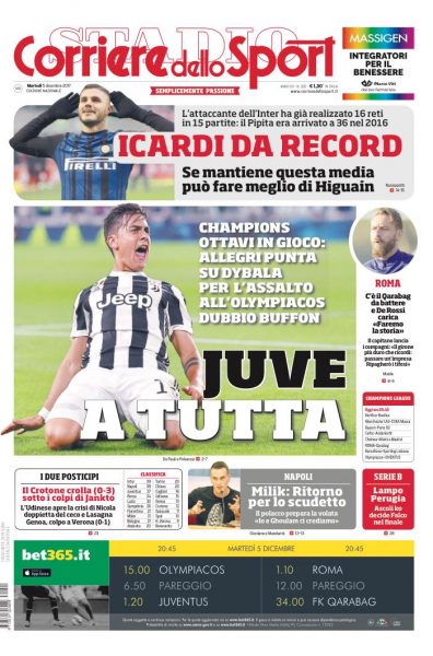 Il Corriere dello Sport offre spazio alla Juventus, che sarà alle prese con l’ultima partita di Champions contro l’Olympiacos per accedere agli ottavi. In taglio alto spazio dedicato ad Icardi, che con questa media gol può superare il record di Higuain con la maglia del Napoli. In taglio basso si trovano le dichiarazioni di Milik che sono una promessa: “Ritorno per lo scudetto“.