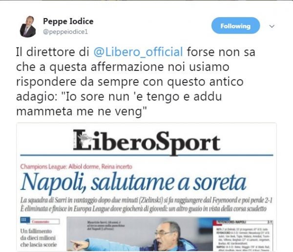 In molti in città si sono sentiti offesi da tale titolo, e qualcuno ha voluto rispondere. Tra questi c’è il comico Peppe Iodice che su Twitter ha scritto un post ironico e geniale, come solo un napoletano saprebbe fare: “Il direttore di @Libero_official forse non sa che a questa affermazione noi usiamo rispondere da sempre con questo antico adagio: “Io sore nun ‘e tengo e addu mammeta me ne veng”“.