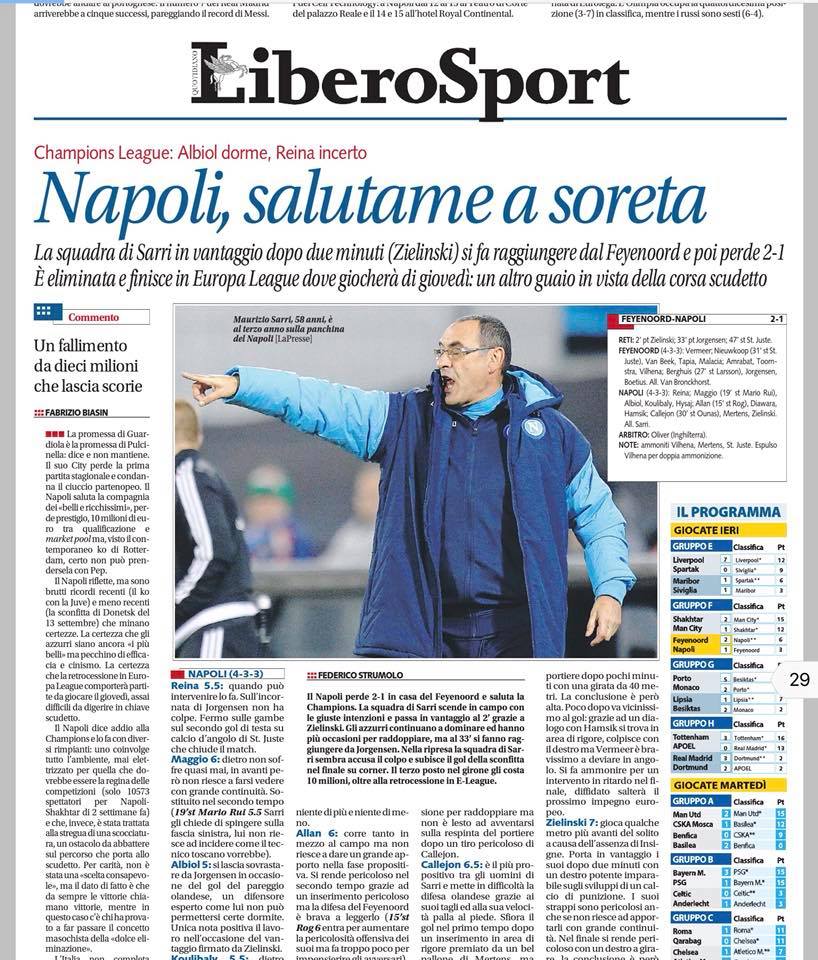 L’uscita dalla Champions del Napoli è accolta con un titolo abbastanza provocatorio da parte di Libero, che attinge dal dialetto napoletano: “Napoli, salutame a soreta“. Proprio la frase che nei giorni scorsi aveva già fatto infuriare il napoletano Ferrara, pronunciata dal presidente della Samp Ferrero. Stavolta, si immagina, farà infuriare altri napoletani.