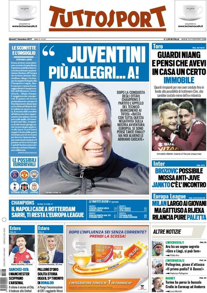 Tuttosport dedica come consueto la sua prima pagina alla Juventus e alla maggior allegria da ritrovare, soprattutto dopo la vittoria di Napoli ed il passaggio agli ottavi di Champions. C’è spazio, ovviamente, anche per il Napoli: “Sarri, ora ti resta l’Europa League” – si legge nel titolo. Fari puntati anche in casa Inter: manca ormai pochissimo al grande match tra bianconeri e nerazzurri.