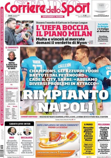 Il Corriere dello Sport invece apre con un eloquente riferimento al “rimpianto” del Napoli, con la mancata qualificazione agli ottavi di Champions. In particolare i colleghi del Corriere si soffermano sulle parole di Sarri, con chiari riferimenti ai problemi in fase offensiva che la squadra sta accusando nell’ultimo periodo.