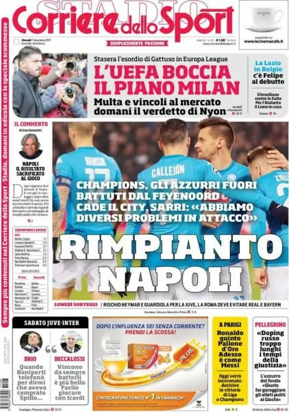 Il Corriere dello Sport invece apre con un eloquente riferimento al “rimpianto” del Napoli, con la mancata qualificazione agli ottavi di Champions. In particolare i colleghi del Corriere si soffermano sulle parole di Sarri, con chiari riferimenti ai problemi in fase offensiva che la squadra sta accusando nell’ultimo periodo.
