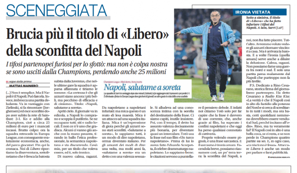 Ha fatto discutere, e non poco, il titolo di ieri pubblicato dal quotidiano Libero, all’indomani dell’eliminazione del Napoli dalla Champions League (QUI PER APPROFONDIRE).