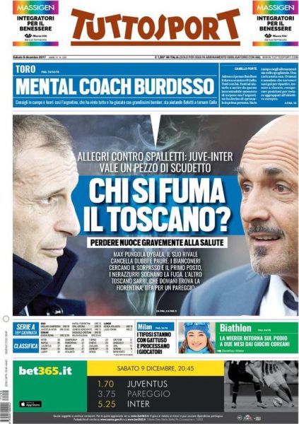 Su Tuttosport si apre con una battuta e il duello tra Allegri e Spalletti: “Chi si fuma il toscano? Perdere nuoce gravemente alla salute. Juve-Inter vale un pezzo di scudetto, Sarri tifa per un pareggio“.