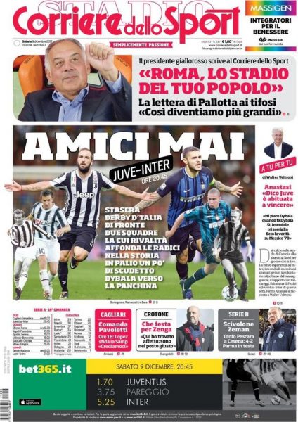 Il Corriere dello Sport apre con: “Juve-Inter, amici mai“. In taglio alto la lettera di James Pallotta che parla di stadio e dei progetti futuri con la Roma.
