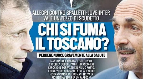 Su Tuttosport si apre con una battuta e il duello tra Allegri e Spalletti: “Chi si fuma il toscano? Perdere nuoce gravemente alla salute. Juve-Inter vale un pezzo di scudetto, Sarri tifa per un pareggio“.