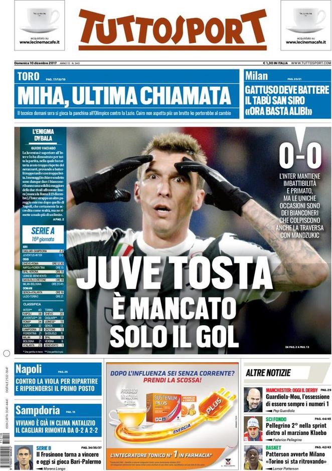 Juventus ed Inter impattano sullo zero a zero: bicchiere mezzo vuoto da un lato, mezzo pieno dall’altro. Le prime pagine dei quotidiani oggi in edicola, Tuttosport e Corriere dello Sport, si focalizzano su questo. Bianconeri che ci provano e ai quali manca solo il gol, Inter che invece resiste e strappa un altro risultato buonissimo. Dopo il pari di Napoli e la vittoria di Roma, per i nerazzurri un’altra bella notizia in un altro scontro diretto.