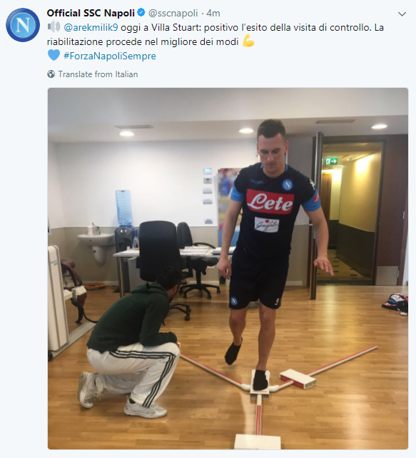 ORE 16.00 – Direttamente dalla pagina Twitter del Napoli un’ottima notizia su Arek Milik.