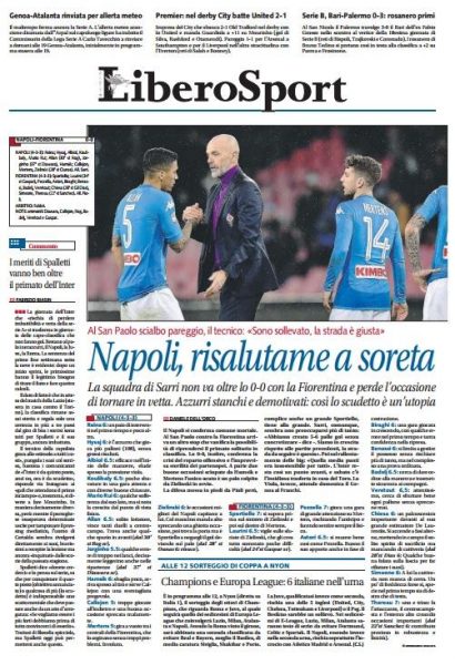 Anche all’indomani del pari ad occhiali con la Fiorentina, sulle pagine sportive Libero replica: “Napoli, risalutame a soreta”.