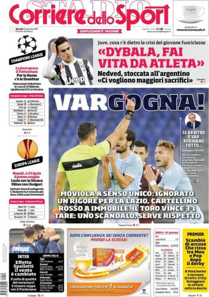 Il Corriere dello Sport non le manda a dire: “VARgogna!” è l’apertura in riferimento all’utilizzo del VAR in Lazio Torino. In taglio alto le parole di Nedved: “Dybala, fai vita da atleta“.