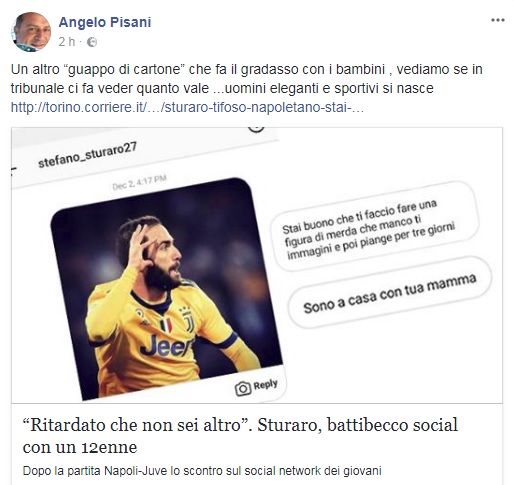 Sono ore concitate per il centrocampista della Juventus, Stefano Sturaro. Il portale fanpage.it nelle scorse ore ha infatti pubblicato alcuni screen di una conversazione privata avvenuta tra il calciatore bianconero ed un bambino tifoso del Napoli di 12 anni.