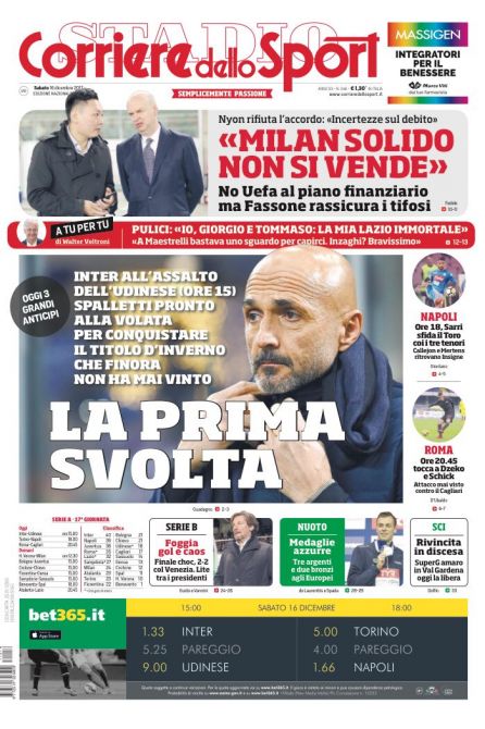 Corriere dello Sport apre con gli anticipi del sabato di Inter, Napoli e Roma, con Spalletti alla volata per conquistare il titolo di campione d’inverno: “La prima svolta“. In taglio alto spazio al no della Uefa per il piano finanziario del Milan, con Fassone che rassicura: “Milan solido, non si vende“.