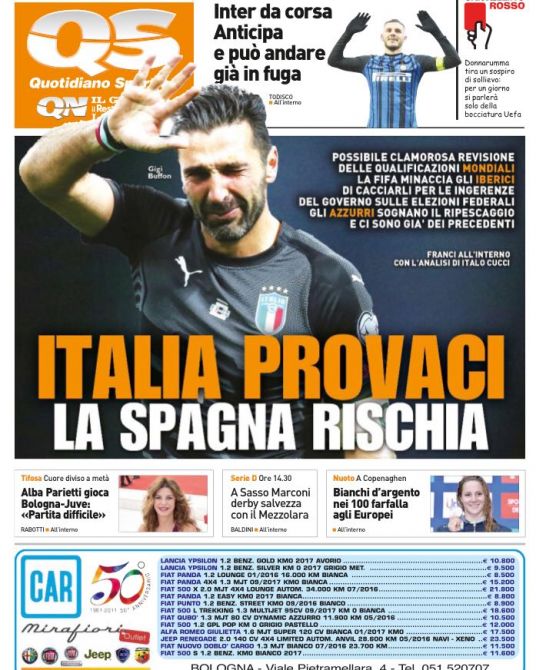 Quotidiano Sportivo offre spazio alla nazionale, con la revisione delle qualificazioni mondiali e la Fifa che minaccia la Spagna per ingerenze del governo sulle elezioni federali ed un possibile ripescaggio dell’Italia: “Italia provaci, la Spagna rischia”