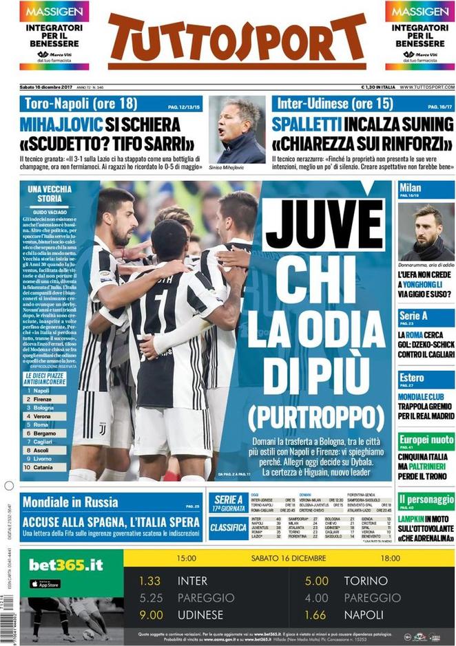 Tuttosport apre con un focus sulle piazze “antibianconere”, con Napoli al primo posto: “Juve, chi la odia di più“. In taglio alto invece spazio dedicato a Torino-Napoli, con le dichiarazioni di Mihajlovic: “Scudetto? Tifo Sarri“.