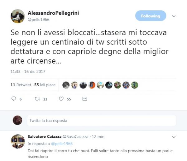 “Se non li avessi bloccati…stasera mi toccava leggere un centinaio di tw scritti sotto dettatura e con capriole degne della miglior arte circense…“.
