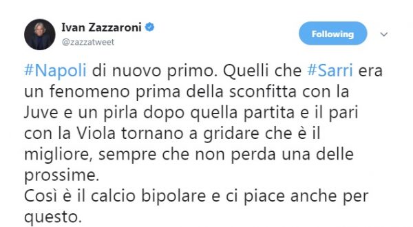 “#Napoli di nuovo primo. Quelli che #Sarri era un fenomeno prima della sconfitta con la Juve e un pirla dopo quella partita e il pari con la Viola tornano a gridare che è il migliore, sempre che non perda una delle prossime. Così è il calcio bipolare e ci piace anche per questo“.