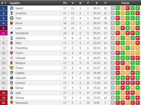 Si è conclusa la 17esima giornata di serie A. Vittoria in scioltezza per la Juve in quel di Bologna: 3-0 e goal di Pjanic, Mandzukic e Matuidi. I bianconeri tornano a -1 dal Napoli, scavalcando l’Inter al secondo posto.