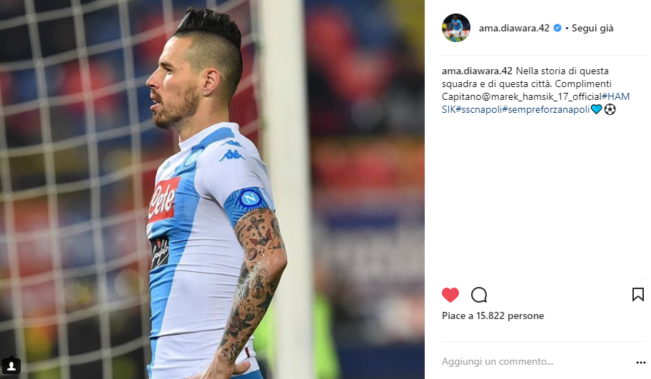 Non è mancato il messaggio di Amadou Diawara che sul suo profilo Instagram gli ha dedicato un post e poi una story. “Nella storia di questa squadra e di questa città. Complimenti Capitano”, ha scritto.