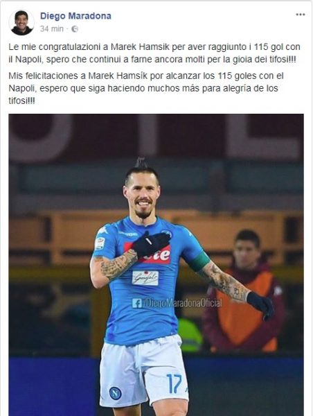 Tra i vari messaggi non poteva mancare proprio il suo, quello del Pibe De Oro che di fatti effettua il cambio di testimone chiedendo ad Hamsik di continuare a segnare per i tifosi azzurri: “Le mie congratulazioni a Marek Hamsik per aver raggiunto i 115 gol con il Napoli, spero che continui a farne ancora molti per la gioia dei tifosi!!!“.