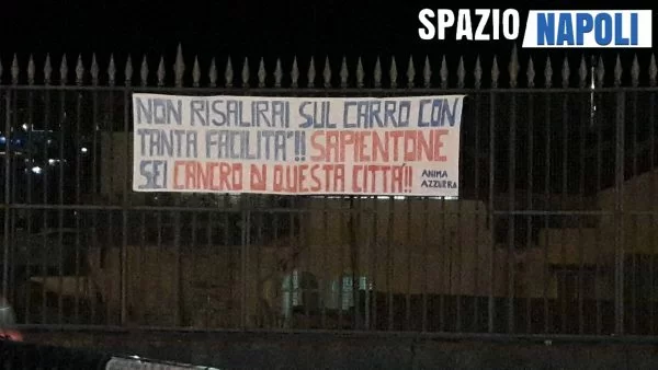 “Non risalirai sul carro con tanta facilità!! Sapientone sei cancro di questa città!!“, questo il testo dello striscione.