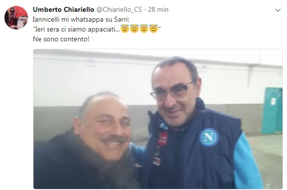 A mostrarlo è il giornalista Umberto Chiariello che su Twitter scrive: “Iannicelli mi whatsappa su Sarri: “Ieri sera ci siamo appaciati…”. Ne sono contento!”