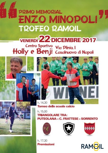 È nato così il Trofeo calcistico “Memorial Enzo Minopoli”, la cui prima edizione è in programma il 22 dicembre presso il Centro Sportivo “Holly e Benji” di via Plinio, 1 (Casalnuovo di Napoli). L’evento vedrà protagonisti, dalle 14.30, i bambini delle Scuole Calcio del territorio – Real Casarea, Progetto Giovani, United Angri e Belsito Soccer – e le loro famiglie; dalle ore 15, invece, tre squadre che militano in Eccellenza – la Puteolana, la Frattese e il Sorrento – si sfideranno in un triangolare. Alle 17.30 è in programma la cerimonia di premiazione.