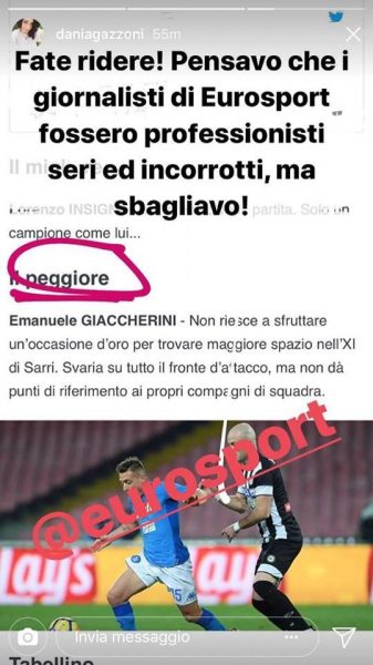 Bersaglio del suo sfogo sono state le pagelle dei colleghi di Eurosport che hanno giudicato l’ex Juve peggiore in campo. “Fate ridere! Pensavo che i giornalisti di Eurosport fossero professionisti seri ed incorrotti, mi sbagliavo“, questo ciò che ha scritto lady Giaccherini in una storia sul suo profilo Instagram.