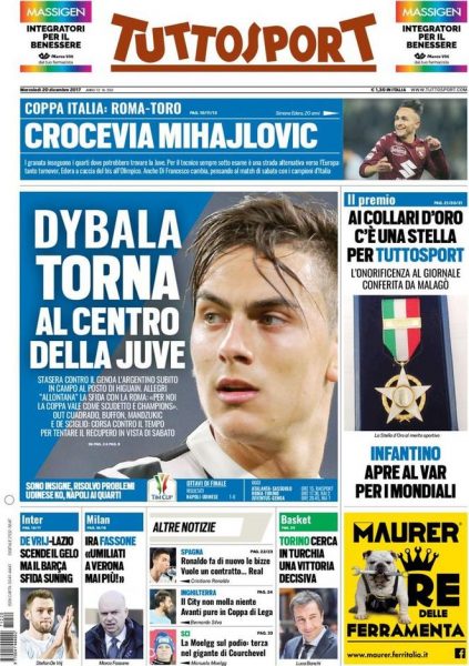 Tuttosport apre con: “Dybala torna al centro della Juve“. in taglio basso invece tanto spazio al mercato.