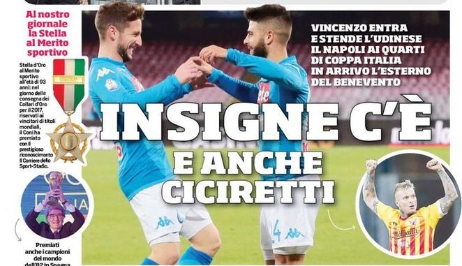 Il Corriere dello Sport apre con il Napoli, commettendo però una gaffe: “Insigne c’è, Vincenzo entra e segna“. Evidente confusione sul nome di Insigne che è diventato Vincenzo anziché Lorenzo. Non mancano novità anche su Ciciretti, mentre in taglio alto si parla di VAR.