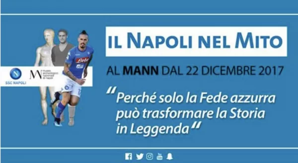 “Il Napoli nel mito”, questo è il nome della mostra sulla storia della SSC Napoli che aprirà al pubblico domani, 22 dicembre, fino al 28 febbraio. L’esposizione è nata dalla collaborazione tra il MANN diretto da Paolo Giulierini e la SSC Napoli che già ha prodotto, lo scorso anno, un originale calendario con i calciatori azzurri ritratti tra i capolavori del Museo Archeologico Nazionale di Napoli. Si potranno ammirare per la prima volta, tutti i trofei vinti dalla squadra azzurra nel corso della sua storia, insieme a memorabilia e cimeli. Il museo sarà aperto tutti i giorni, tranne il martedì, dalle 09:00 alle 19:30. La SSC Napoli, sul suo sito ufficiale, ha rivelato tutti i dettagli riguardo all’iniziativa.