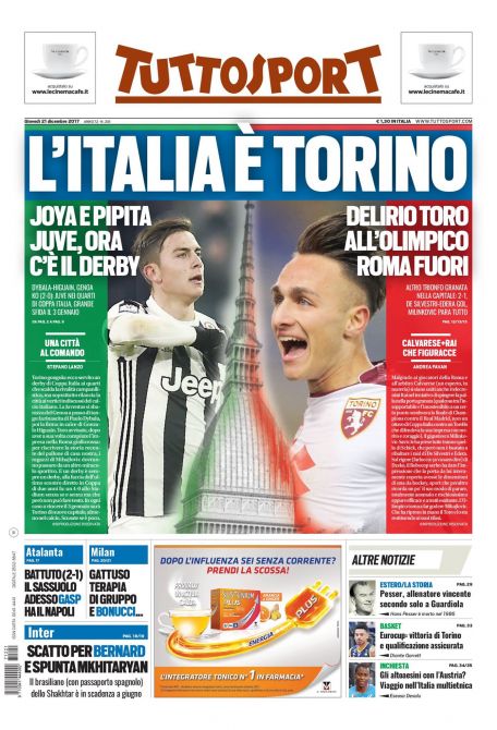 Tuttosport celebra le due vittorie di Torino e Juve in Tim Cup, che ora si affronteranno tra loro ai quarti. Forte il titolo: “L’Italia è Torino”.