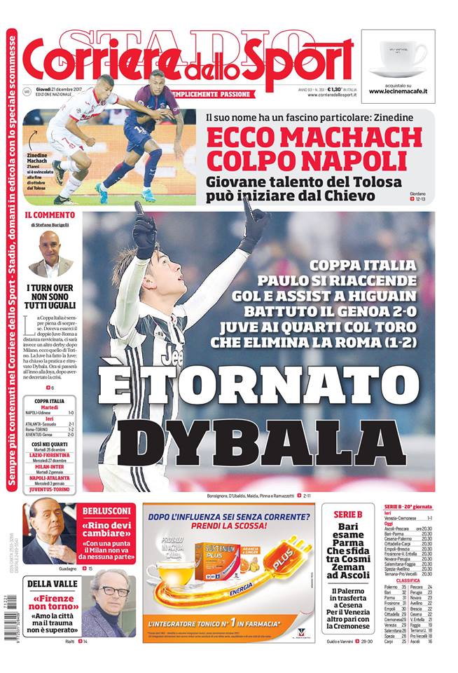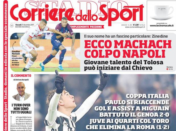 Il Corriere dello Sport presenta l’affare Machach, ultimo in ordine temporale in casa Napoli. Pare ormai fatta e, anzi, sembra perfino che Giuntoli abbia già deciso il suo destino: prestito al Chievo fino a giugno e poi rientro sotto al Vesuvio. In prima pagina spazio soprattutto alle gare di Coppa Italia disputatesi.