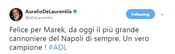 Il patron azzurro ha così scritto un messaggio su Twitter: “Felice per Marek, da oggi il più grande cannoniere del Napoli di sempre. Un vero campione ! #ADL“.