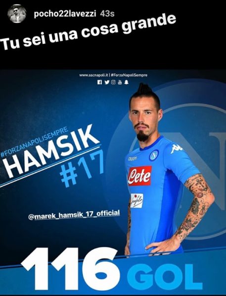Tra i tanti che stanno scrivendo ad Hamsik, spicca il messaggio del Pocho Lavezzi che su Instagram ha postato una foto dell’ex compagno e di napoletana memoria ha scritto: “Tu sei una cosa grande“.