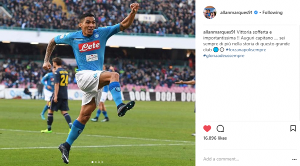 E proprio sul successo contro la Samp è tornato il centrocampista azzurro Allan con un post sui social: “Vittoria sofferta e importantissima !! Auguri capitano… sei sempre di più nella storia di questo grande club”.