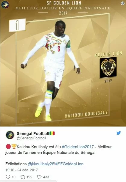 Kalidou Koulibaly non smette di confermarsi ai massimi livelli, grazie alle sue prestazioni. Il difensore azzurro ha infatti ricevuto il riconoscimento del Leone d’Oro, vinto per essere stato giudicato come miglior calciatore senegalese del 2017, davanti a Ndiaye e all’ex laziale Keita.