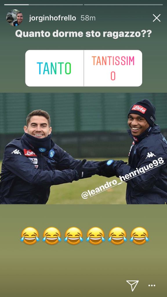 Una personalità solare, come dimostra spesso, con l’obbiettivo di far sorridere anche gli altri. Oggi è toccato a Leandrinho entrare a far parte delle sue stories su Instagram. Jorginho ha infatti postato una foto dell’allenamento di oggi in compagnia del giovane attaccante brasiliano, aggiungendo la frase scherzosa “Quanto dorme sto ragazzo?”.