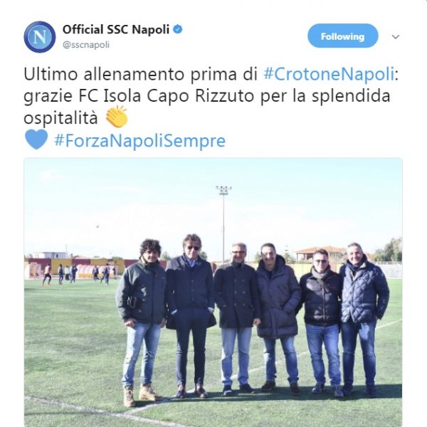 La truppa di mister Sarri è stata infatti ospitata dall’FC Isola Capo Rizzuto, e il Napoli ha così voluto ringraziare postando una foto con tanto di messaggio su Twitter: “Ultimo allenamento prima di #CrotoneNapoli: grazie FC Isola Capo Rizzuto per la splendida ospitalità 👏 💙 #ForzaNapoliSempre“.